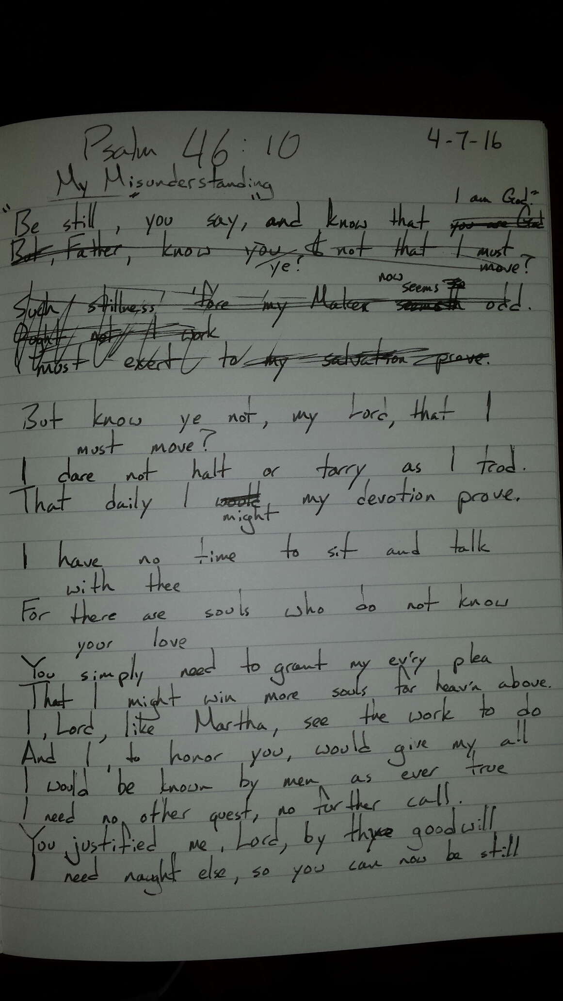 Note: This poem is satirical in nature. Psalm 46:10 challenged me lately. I realized that I live all too often as if ministry depends upon my efforts rather than recognizing that God brings the growth. I also realized that I can all too easily sacrifice time with the Lord when school and ministry get demanding. That’s not the right option at all. I need to spend time with God first, and live and work in his strength. This poem, then, is an exaggeration; I don’t actually pray this. But I often live as if I don’t need God for the work he’s called me to do. This poem, in a way, is a confession that I need to learn to “be still” and know that he is God.