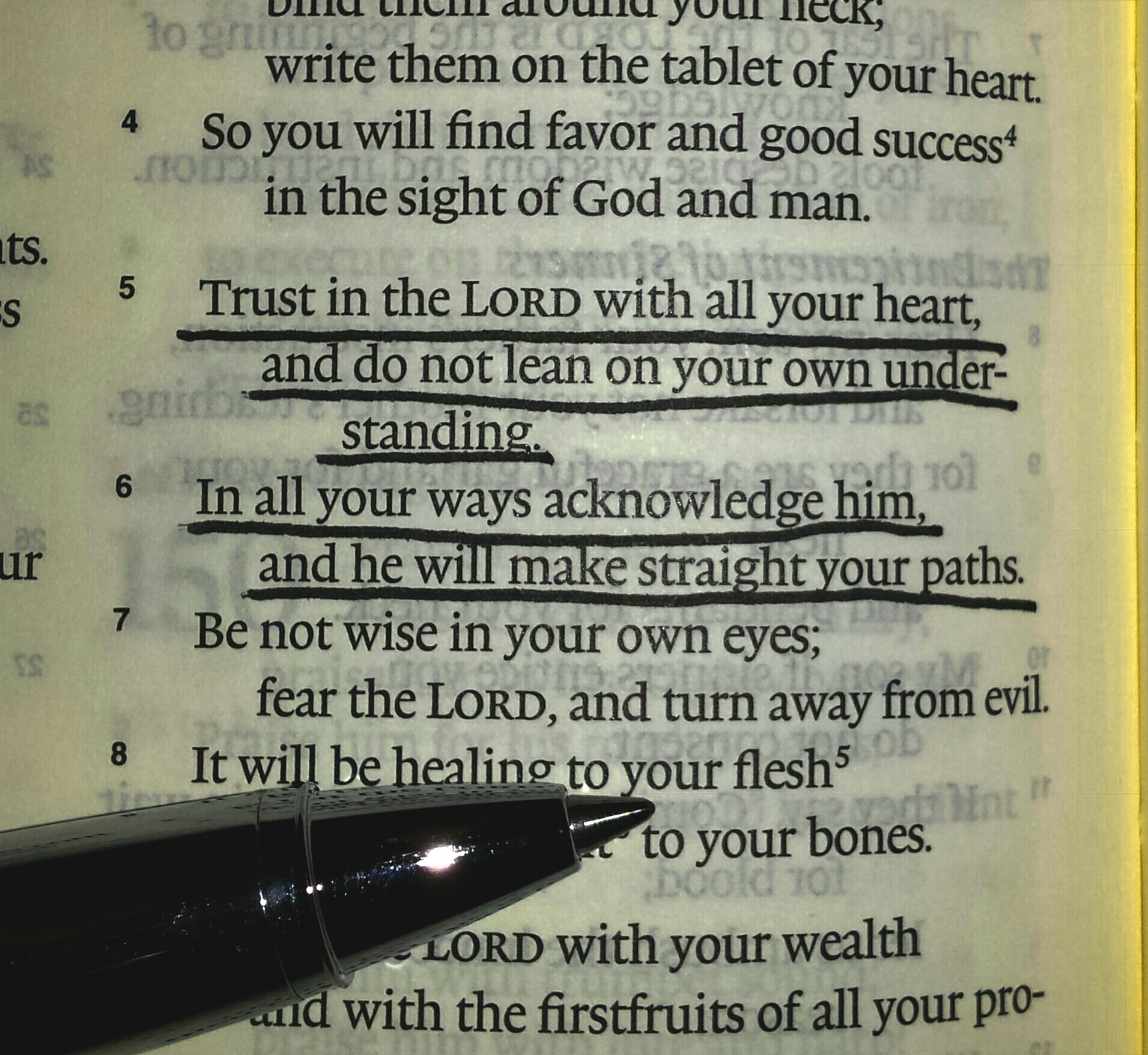 Trust in the LORD with all your heart, and do not lean on your own understanding. In all your ways acknowledge him, and he will make straight your paths.